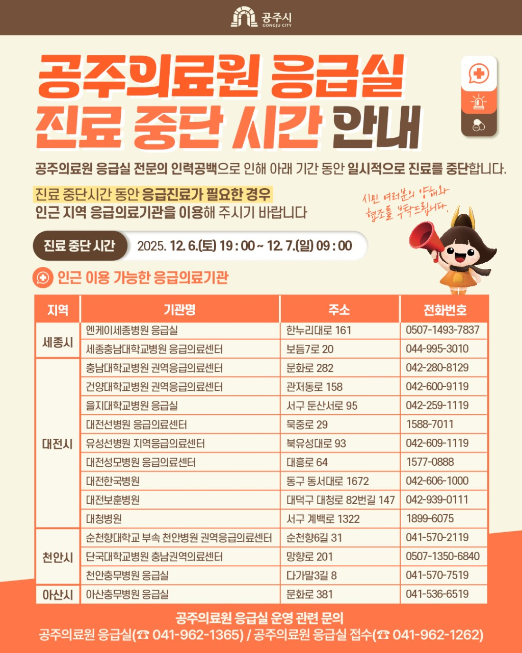 공주의료원 응급실 진료 중단 안내 / 2025.12.6.(토) 19:00~2025.12.7.(일) 09:00