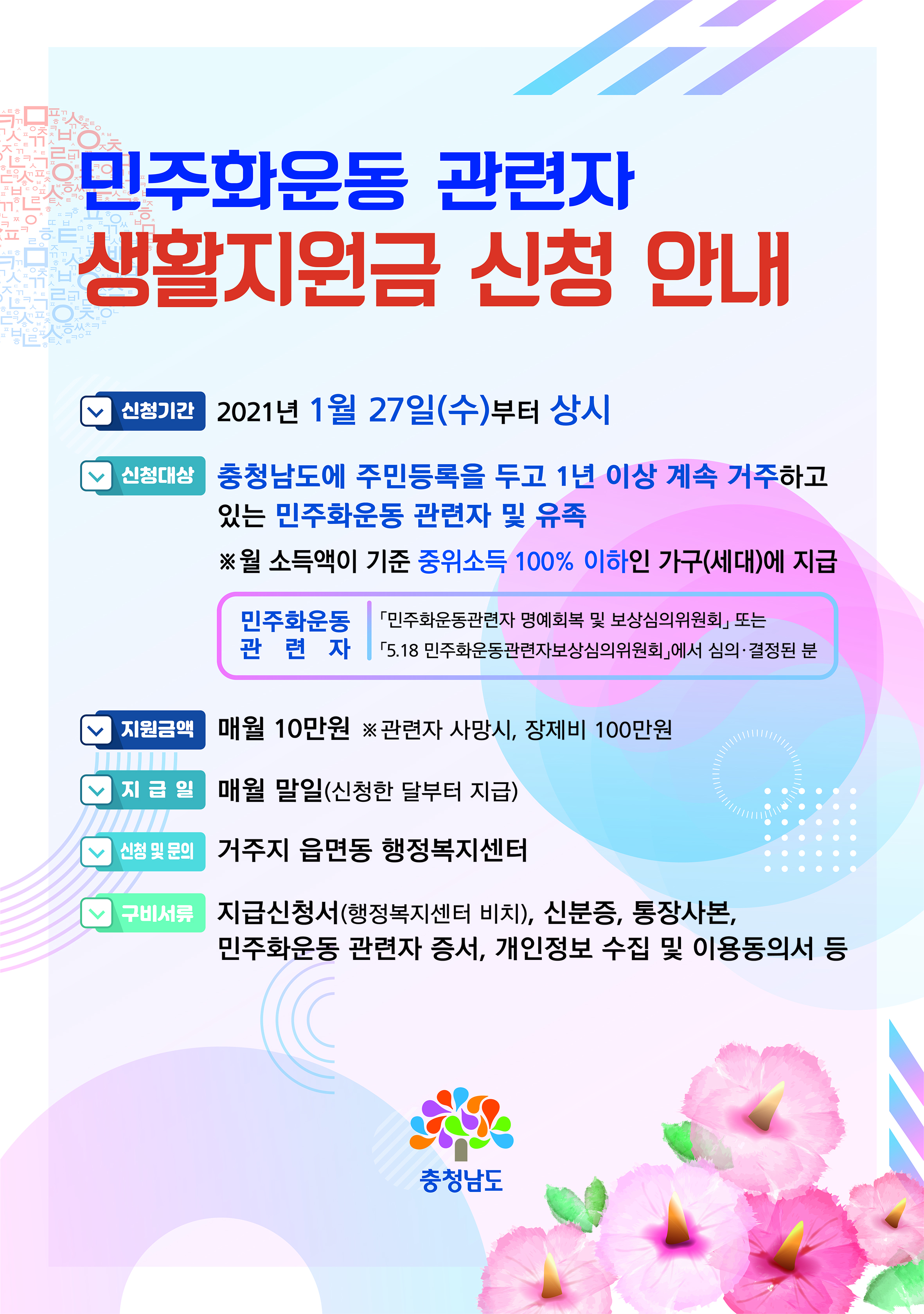 | 586 | 민주화운동 관련자 ‘예우’…생활비 지원 | 탄천면 | 53 | 2021-01-29 | 사본 -민주화운동지원금-포스터(수정).jpg |