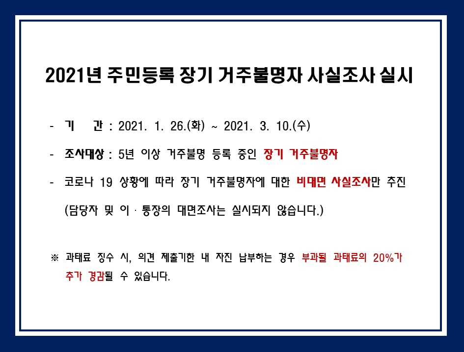 | 587 | 2021년 주민등록 장기 거주불명자 사실조사 실시 | 탄천면 | 63 | 2021-01-29 | 거주불명 사실조사.JPG |