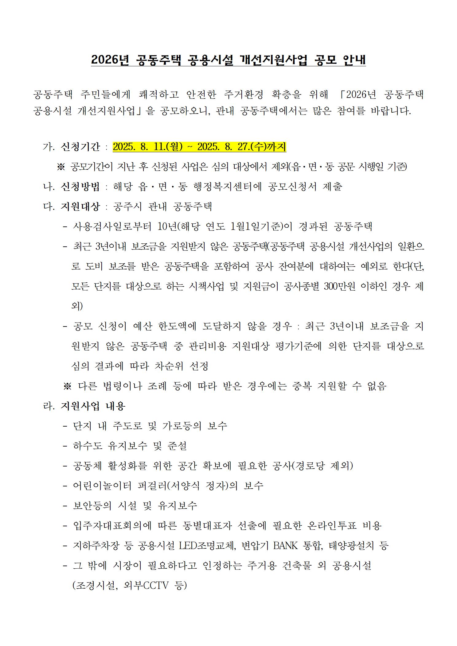 2026년 공동주택 공용시설 개선지원사업 공모 안내