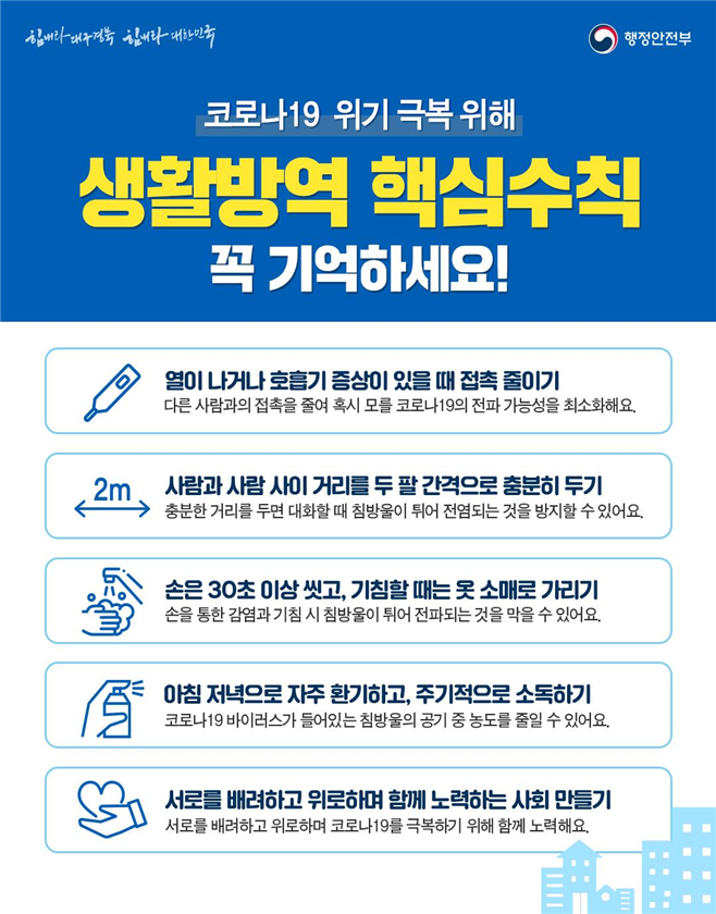 | 919 | 코로나19 위기 극복 「생활방역 핵심수칙」 안내 | 웅진동 | 47 | 2020-05-11 | 생활방역 핵심수칙 안내문.png |