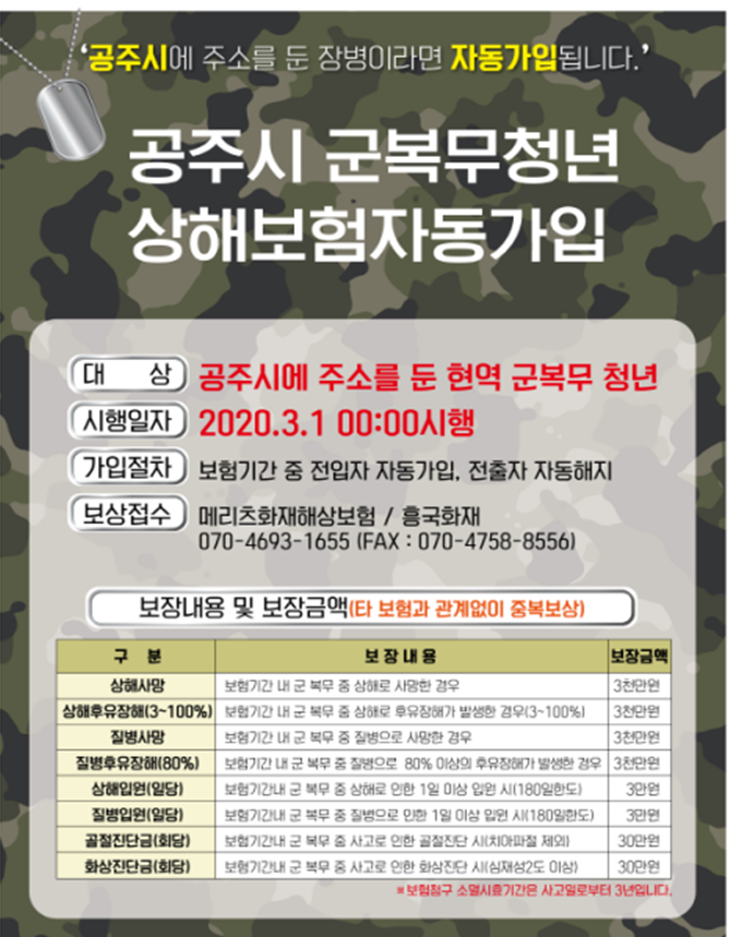 | 921 | 공주시 군복무 청년 상해보험 시행 홍보 | 웅진동 | 40 | 2020-05-11 | 군복무 청년 상해보험자동가입 안내문.png |