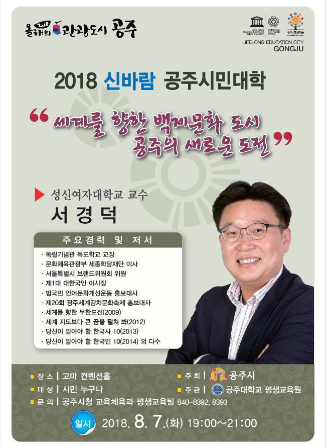 공주시민대학 제46강 '서경덕교수의 세계를 향한 백제문화 도시 공주의 새로운 도전' 강의 안내